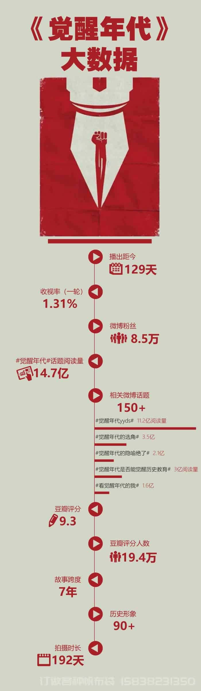 距離《覺醒年代》首播已經過去近130天。截至6月10日,該劇微博話題14.7億、豆瓣評分9.3,相關熱搜話題達150個,外界或許很難想象,這樣可持續性的熱度會出現于當下的一部主旋律獻禮作品??蓪Ρ鹊氖?,2017年的年度爆款劇《人民的名義》截至目前微博話題閱讀量為27.1億,但豆瓣評分僅8.3;而口碑在《覺醒年代》之上的主旋律作品,只有多年前的《走向共和》、《我的團長我的團》、《亮劍》和《士兵突擊》。