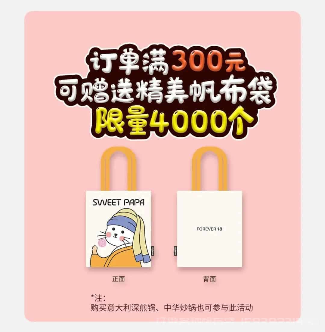 在天貓、淘寶、微店購物滿300元,將獲得咱精心定制設計的帆布袋,活動期間有買咱家意大利深煎鍋或中華炒鍋的朋友也將獲得一個。