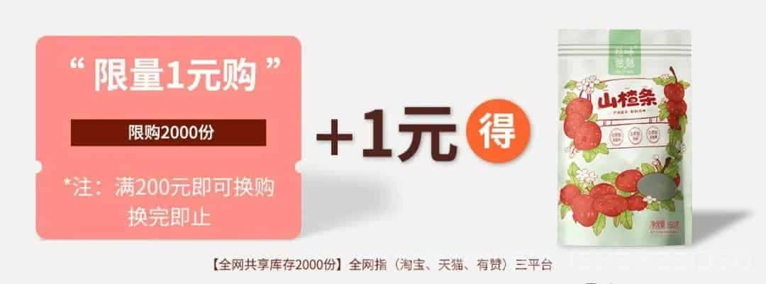 這次三個店鋪滿打滿算能拿出2000袋山楂條參與活動,因為數量真的很有限,所以只有前2000名朋友能在下單購物車滿足訂單金額滿200元時,才會有1元換購的提示。