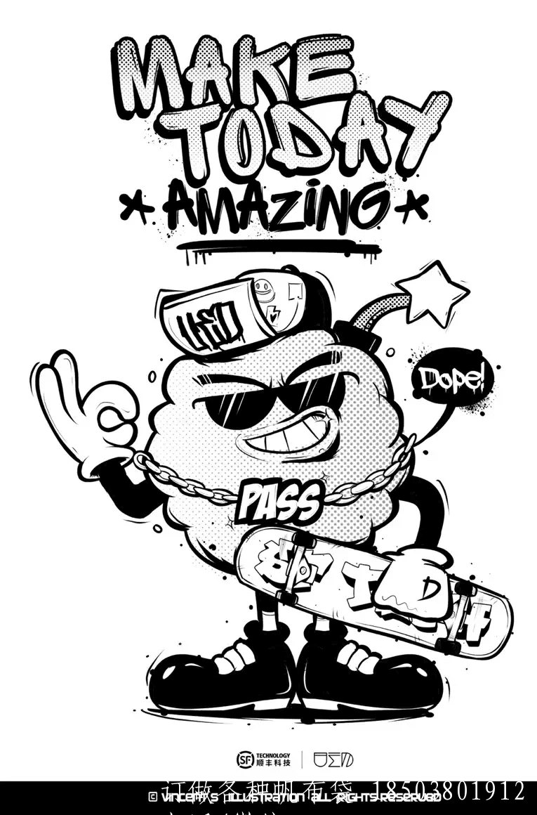 我們給腦頑童的定位是:吉祥物中的“潮人”,所以我們選用了嘻哈向的設計風格。你可以在設定中看到像滑板、墨鏡、Gold Chain這類的元素。今后,我們希望TA能以潮玩的形式跟大家見面。