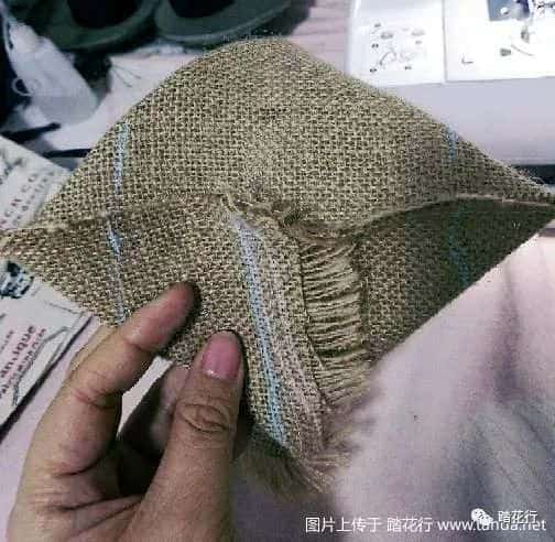 到這里,一個簡單的袋子已經成型了,接下來,把袋子的角折起來縫合。下圖畫藍色線的位置,是縫線。從角尖到藍色線的位置,大概3厘米左右。