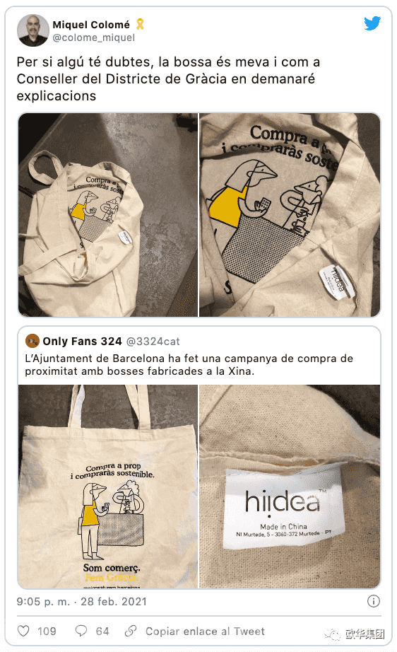 在事情發酵了幾個小時后,人們發現這些袋子不僅來自中國,還有些是在印度生產的。除此之外,這些帆布包不僅不在巴塞羅那生產,連銷售商都位于馬德里。