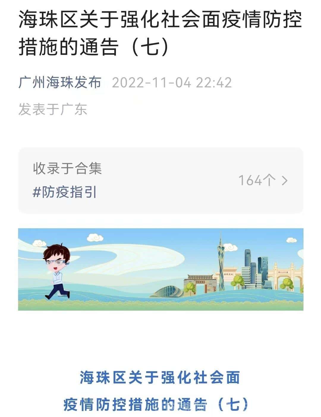 據(jù)廣州海珠發(fā)布微信號消息,11月4日晚,廣州市海珠區(qū)新型冠狀病毒肺炎疫情防控指揮部辦公室發(fā)布通告,為有效阻斷疫情傳播擴散風險,盡快實現(xiàn)社會面動態(tài)清零,切實保障廣大人民群眾生命安全和身體健康,經研判,決定11月5日0時至11月7日24時,在海珠區(qū)全域實行如下防控措施: