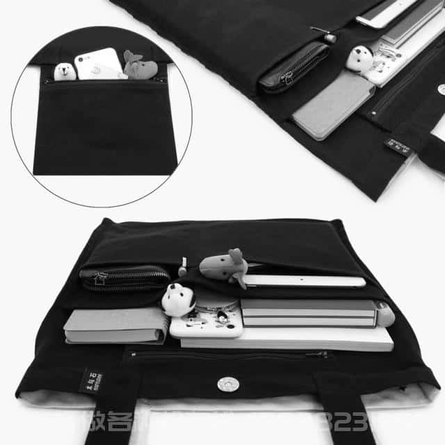 其實(shí)帆布包有個通病,那就是容量很大,同樣也有個壞處,那就是大雜燴一樣,所有東西都堆在一起,要找一樣小東西的時候經(jīng)常手忙腳亂。這款帆布包的內(nèi)部設(shè)計(jì)就解決的這個問題,它內(nèi)部有大中小三個SIZE的口袋,方便大家隨意擺動物品。