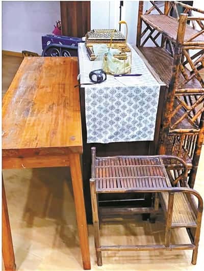 當初,三三用舊物充實她開的咖啡館的時候,曾撿到一個巨大的桌子,那是附近的中醫院搬遷時留下的,三三第一次見到它時充滿了驚訝,“我從來沒見過這么大的桌子”。桌子長2米,寬1米8,比咖啡店的門都要大,桌子的高度也很奇怪,無論是坐著還是站著,都沒法舒服地使用它。三三將桌子腿鋸短后,才得以把它搬進店里。最終,這張桌子成了三三的辦公臺。