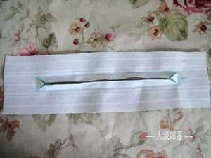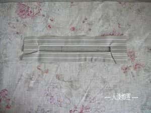 ▼13.把加厚包底用的布片兩邊往內(nèi)各折1cm,熨好: