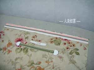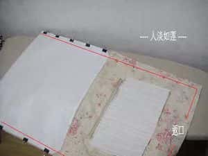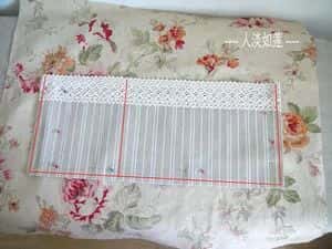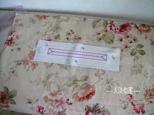 ▼10.拿做內(nèi)貼袋的棉布38*18cm一片,把它縫在另外一片里布上:如圖紅色線,中間壓線,變成一大一小兩個貼袋: