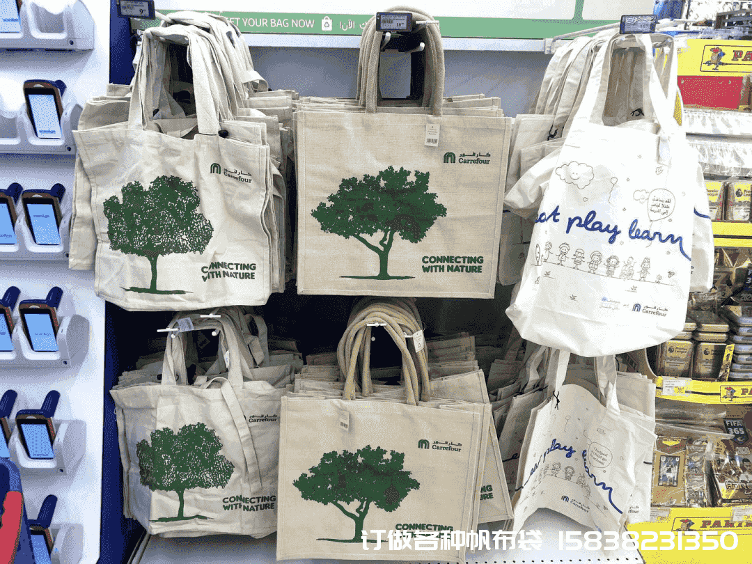 帆布手提袋雖然沒有黃麻袋環保,但可以多樣化團和色彩設計,樣式時尚,可以多功能使用,對于追求時尚的阿聯酋消費者而言,也是比較適合且受歡迎的購物袋商品,當地售價在40迪拉姆。