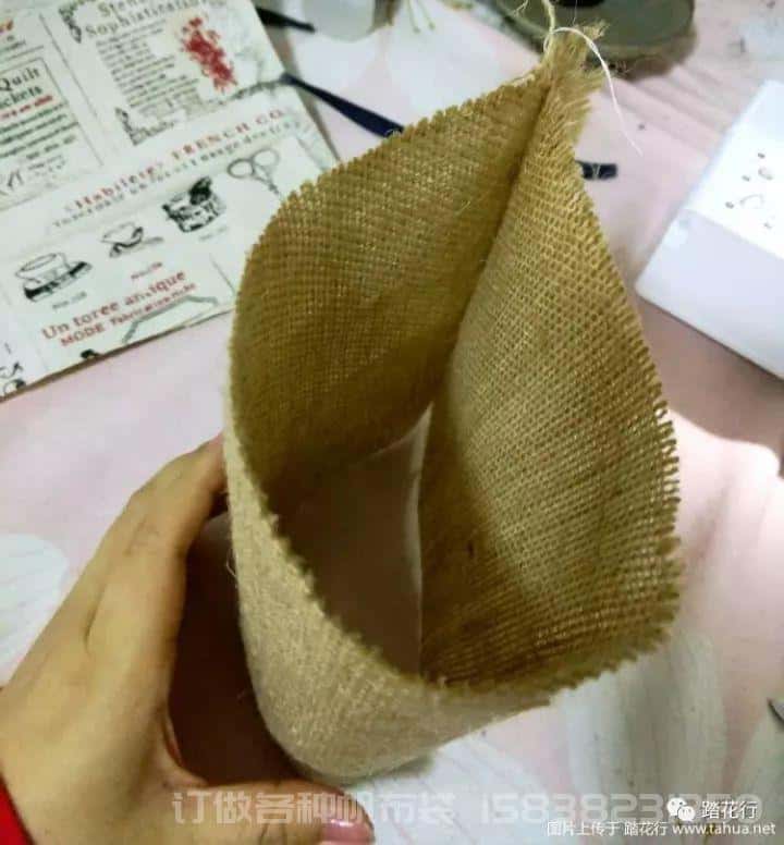 第二步:裁剪??紤]到承重問題,做的比較小,成品口徑能放15厘米口徑的花盆進去。太大的話會壓變形,失去美觀。把麻布和帆布都裁剪成大小一致的長方形,長40厘米,寬18厘米。如果不喜歡這個尺寸,可以自由調整一下。但是切記,里和表的尺寸一定要一致,或者里層帆布尺寸可以稍小一點點,不要超過一厘米。