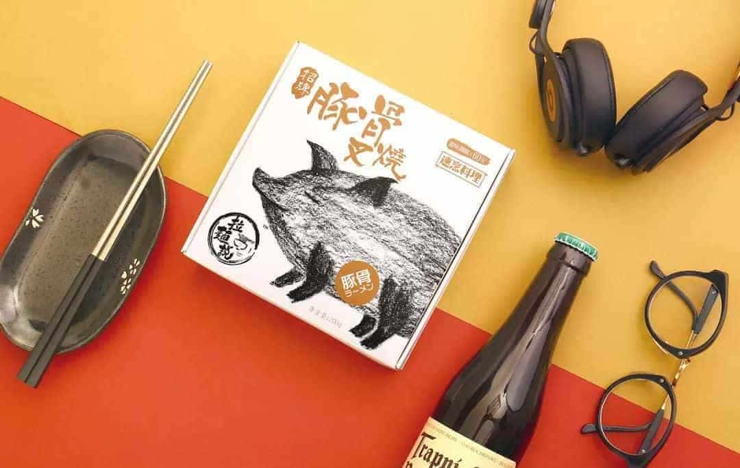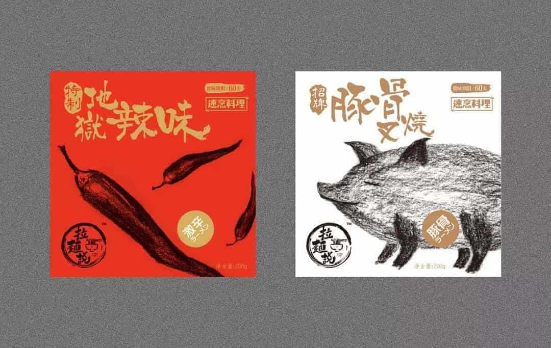 這是一款日式拉面包裝,包括面條與調味料的設計。設計上以大面積的單色為底,配上手繪動植物的插畫,以不同的種類區分不同的口味。風格簡約時尚。