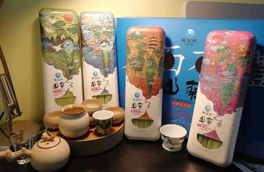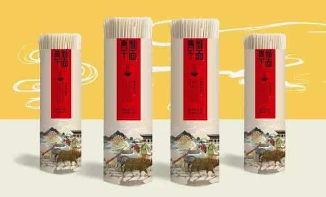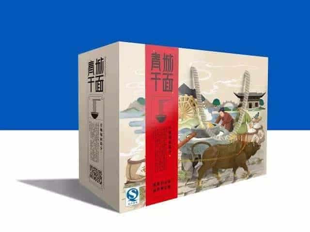 青城干面的包裝展示了一幅農耕景象,勤勞的農夫,遠處的山城景色,很有地方特色。