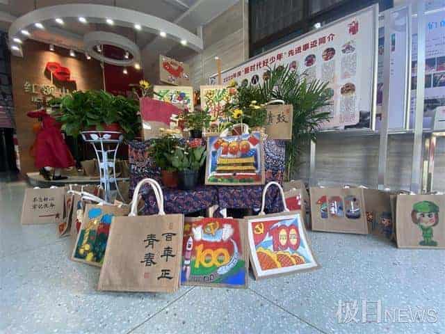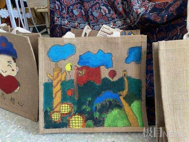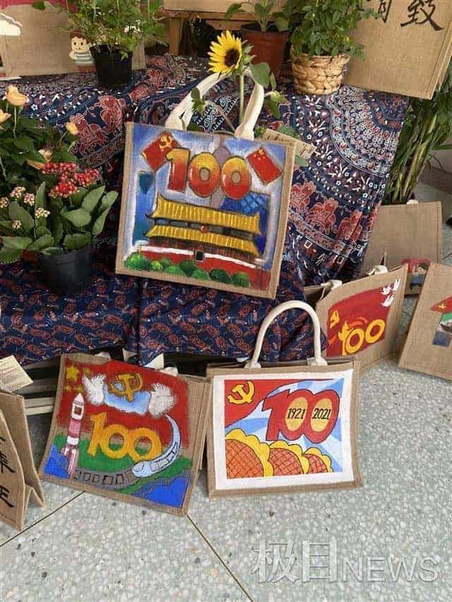 在教學樓樓梯口,極目新聞記者看到,一百三十余個手繪帆布袋陳列在展示臺上,每名教師根據自己的喜好進行挑選。“這些帆布袋由學校美術和書法校隊的學生手繪而成,還有一部分是學生在課后托管的興趣班上完成的。”學校美術老師潘瑜介紹,手繪帆布袋的主題為慶祝建黨100周年,學生發揮自己的想象力設計草圖,再用丙烯顏料在帆布袋上繪制。
