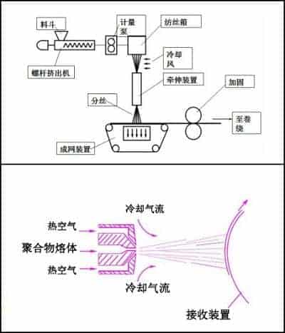 紡絲成網和熔噴成網都是利用化學纖維的紡絲方法,在紡絲成型的過程中使纖維直接鋪置成網。其中紡絲成網是紡絲溶液或熔體從噴絲頭噴出后,經過冷卻、拉伸形成一定細度的長絲,在接收裝置上形成纖維網。而熔噴成網則利用高速熱空氣對噴絲頭噴出的細流進行極度拉伸而形成超細纖維,然后聚集在接收裝置上形成纖維網。熔噴法形成的纖維直徑更小,有利于提高過濾效率。