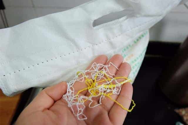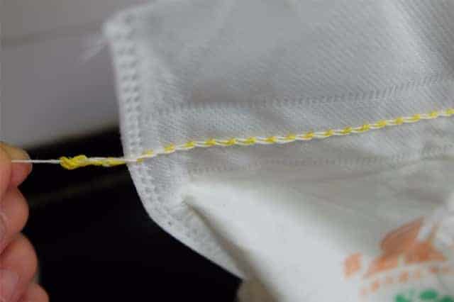 看吧,兩根完整的封口線就在手里了,拆面粉袋是不是很簡單呢。記住這個(gè)小口訣:面粉袋,朝自己,是雙線,左邊拆,是單線,右邊拆,一手一根線,輕輕松松把袋拆。是不是很好記呢!不僅是面粉袋,所有的封口線都是這樣的哦。