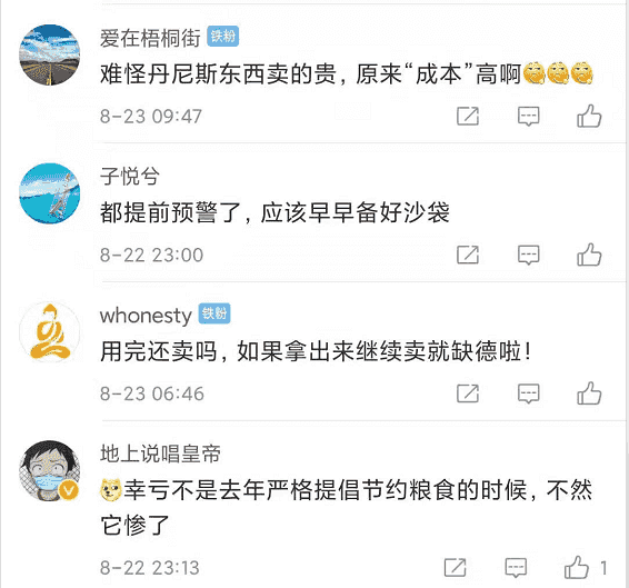 網(wǎng)友紛紛發(fā)表看法:“難怪丹尼斯東西賣得貴,原來‘成本’高啊!”“都提前預(yù)警了,應(yīng)該早早備好沙袋?!薄坝猛赀€賣嗎?如果拿出來繼續(xù)賣就缺德啦!”“幸虧不是去年嚴(yán)格提倡節(jié)約糧食的時(shí)候,不然它慘了!”