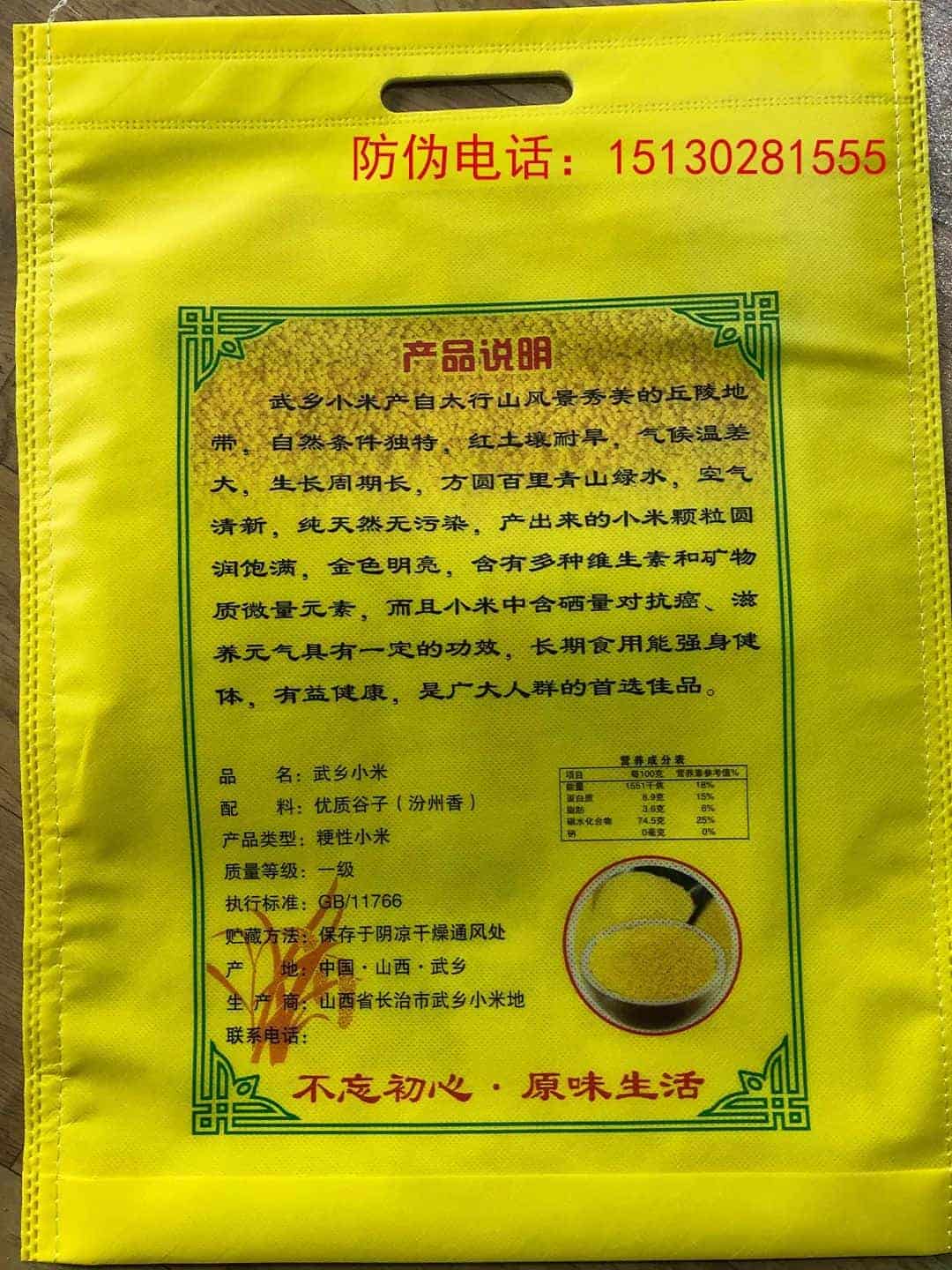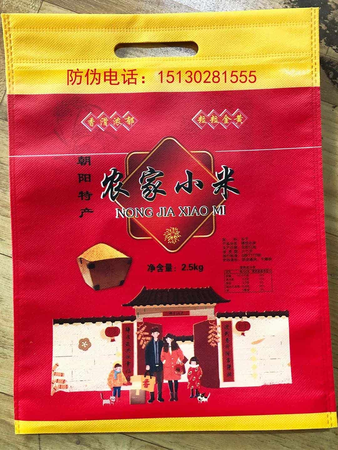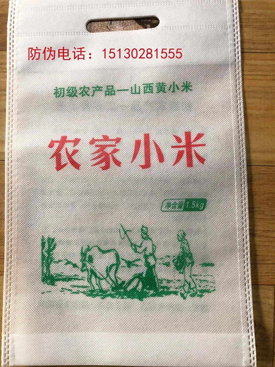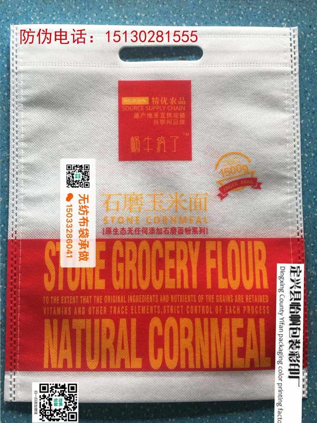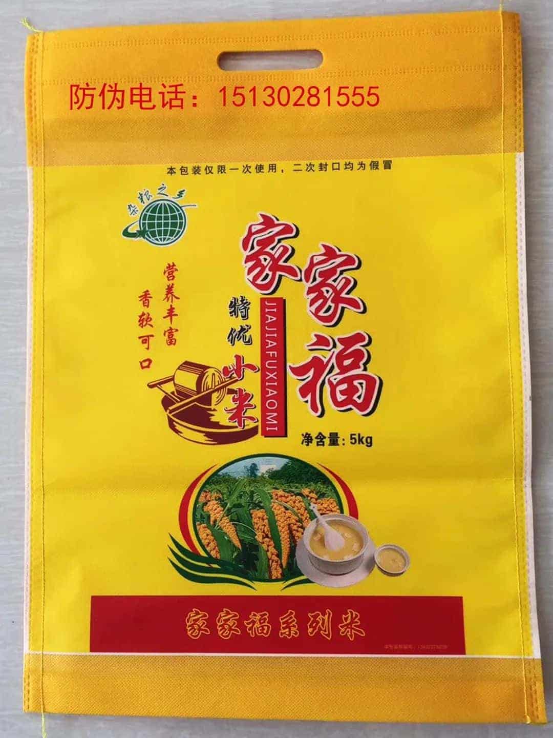 廠家主營產品:無紡布面粉包裝袋,無紡布大米包裝袋,小米袋,無紡布雜糧袋,無紡布手提袋,無紡布廣告袋等無紡布袋系列產品。無紡布面粉袋包裝規格有500克,1000克,2.5公斤,3公斤,5公斤,10公斤等,特殊 規格可以來電定做。