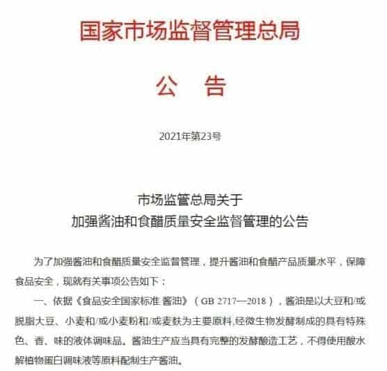 為此,2021年6月29日,國家市場監督管理總局發布公告,對醬油和食醋的質量安全加強監督管理。