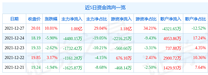 資金流向數據方面,當日主力資金凈流入1.0億元,游資資金凈流入1.18億元,散戶資金凈流出4321.65萬元。近5日資金流向一覽見下表: