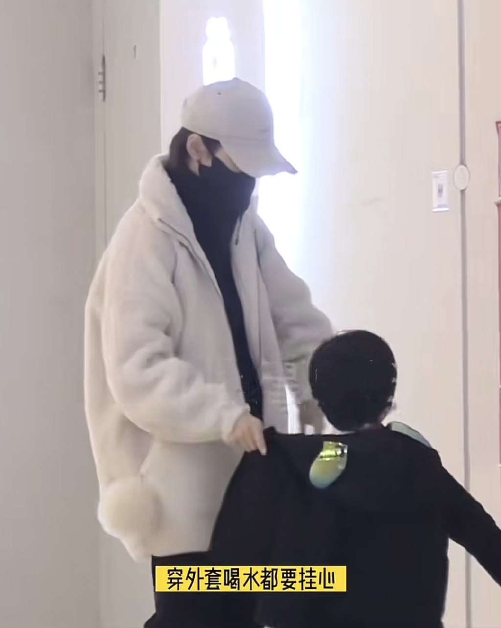 謝楠擔(dān)心兒子會(huì)凍著,給他把衣服穿上保暖,又讓兒子喝了口水,照顧得無微不至。